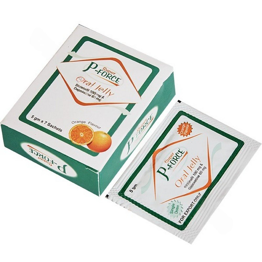 Super P Force oral jelly is an effective medication to treat erectile dysfunction (impotence in men) and premature ejaculation. Super P Force contains the active salts of Sildenafil Citrate and Dapoxetine Hydrochloride. The pack with seven sachets contains flavorful solutions for oral consumption. Super P Force is a proven treatment option to treat erectile dysfunction (ED) and premature ejaculation (PE).